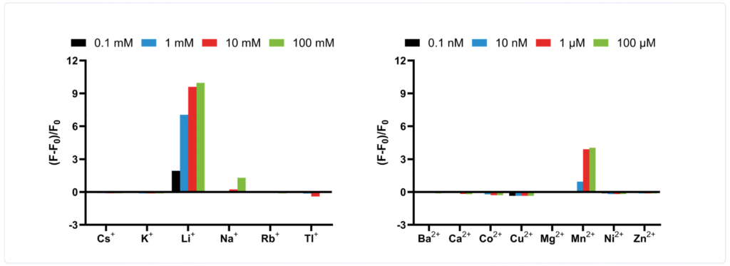 ILG-1 AM, in its active form, displays a robust fluorescence increase to lithium in solution (approximately 10-fold) with an approximate Kd of 422 µM.